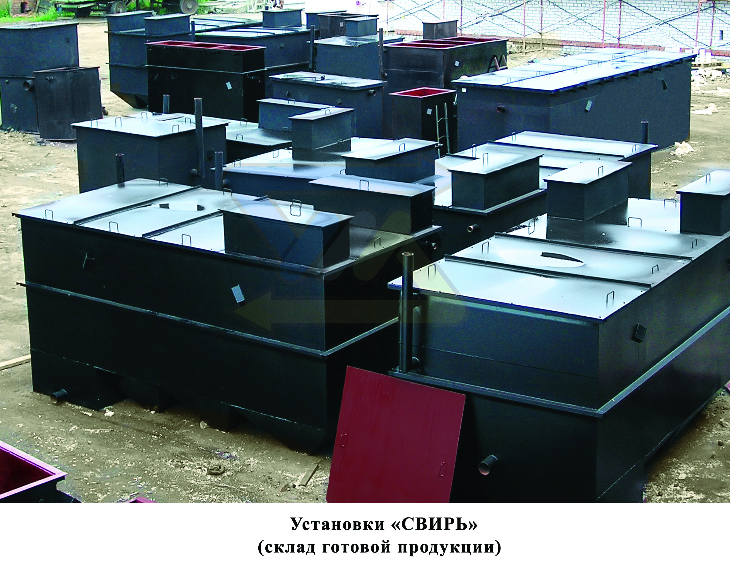 Установка «СВИРЬ-5Н» с принудительным отводом и производительностью 5 л/сек. предназначена для очистки поверхностных сточных вод (дождевых и талых) на территориях автозаправочных станций, автостоянок, складов горюче-смазочных материалов, нефтебаз, промышленных зон и жилых районов с примерной площадью водосбора до 0,125 га. Насосный отсек обеспечивает напорный вывод очищенной сточной воды.